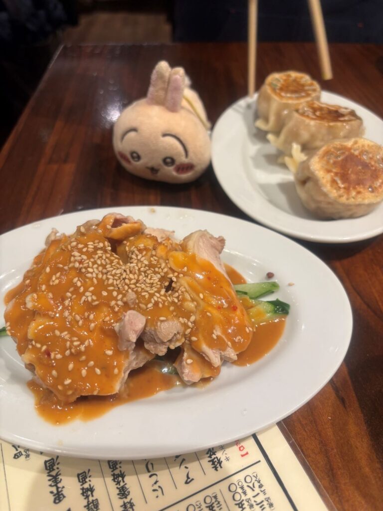 大餃子はジューシー、蒸し鶏のゴマダレ!これも好き!