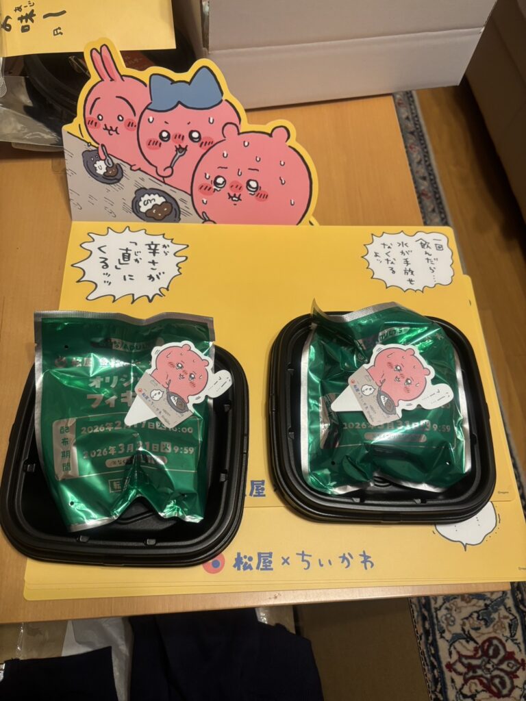 ちいかわ 松屋コラボ、激辛カレーを注文で、ちいかわのフィギュアがランダムでもらえる!